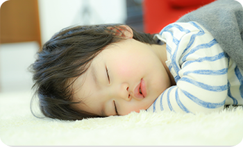 口呼吸の傾向があるお子さんでは、就寝中も口が開いた状態になりやすくなります。その結果、舌が喉の奥へ位置しやすくなり、空気の通り道が狭くなることで、強いいびきや一時的に呼吸が止まる状態がみられることがあります。このような状態が続くと、十分な睡眠がとれず、体調や成長面に影響を及ぼす可能性があります。